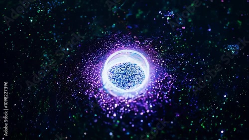 The watermark will not be included on Wall mural.: Cosmic genesis: a mesmerizing cosmic egg, glowing with vibrant purple and blue energy, floats amidst