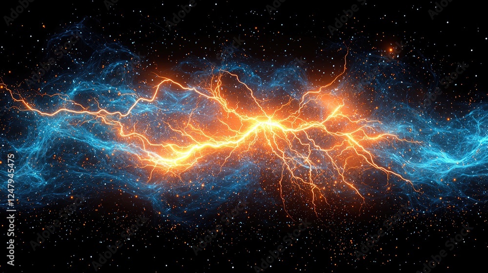Wall mural : Cosmic lightning: a mesmerizing display of celestial energy, where fiery plasma clashes with cool bl