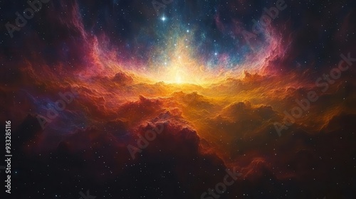 The watermark will not be included on Wall mural.: Cosmic nebula swirling with vibrant colors distant galaxies shimmering stars vast celestial expanse