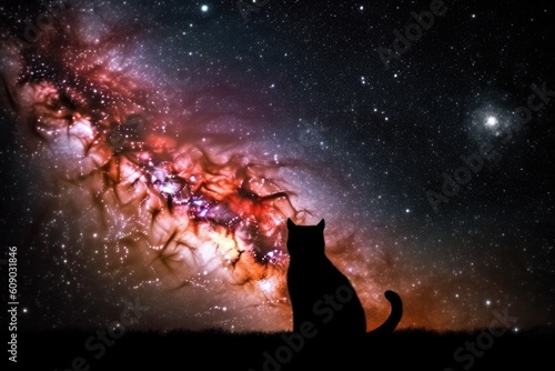 The watermark will not be included on Wall mural.: Cosmic nebula with silhouette of feline and canine astronaut in space, created with generative ai