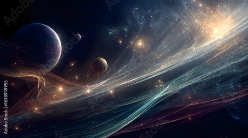 Wall mural : Cosmic scene with ethereal planets and flowing dark energy waves in alignment