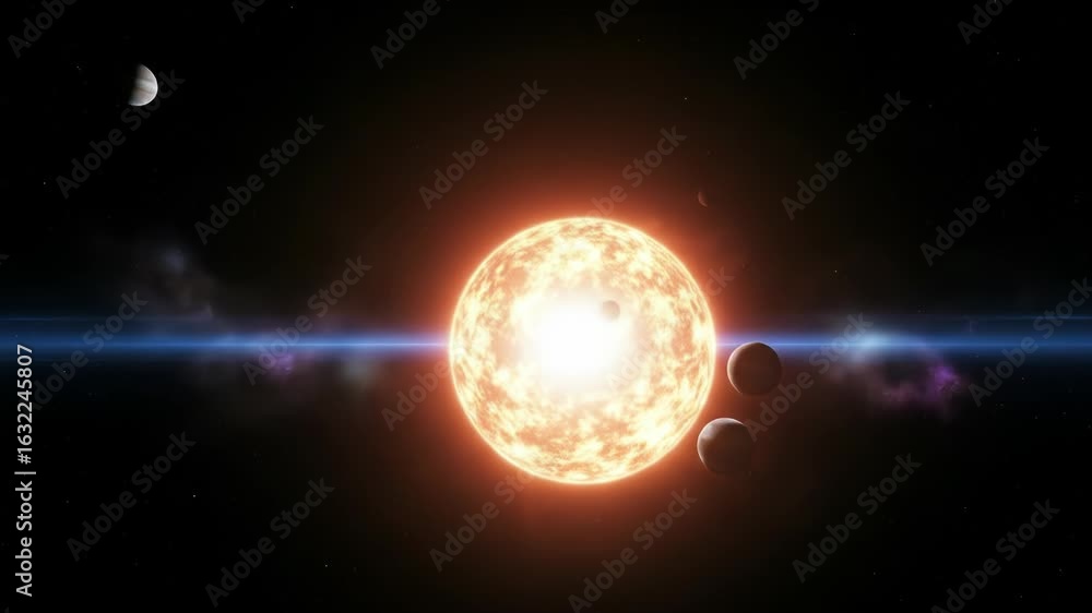 The watermark will not be included on Wall mural.: Cosmic solar flare with planets in dark space rendered with pixelated texture