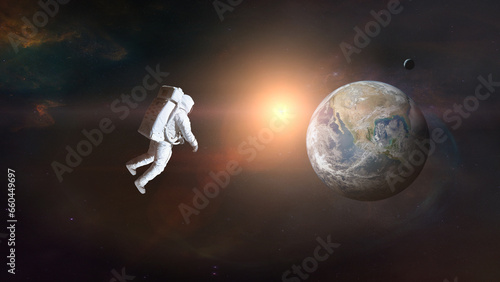 Cosmonaut in outer space on earth background with sunlight - elements of this image furnished by nasaWall mural
