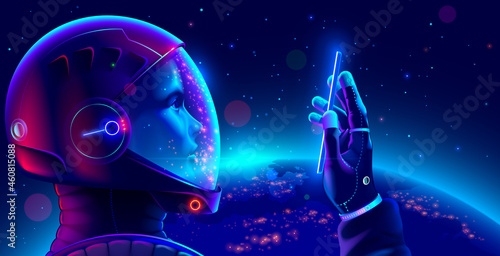 Wall mural : Cosmonaut in space suit in outer space with phone in hand looks at screen and makes selfie - astronau