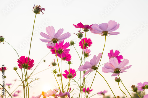 Wall mural cosmos flower and white sky in twilight,pink and whtie cosmos. cosmos bipinnatus.
