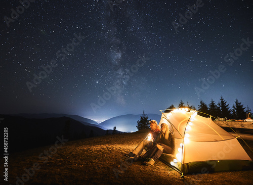 The watermark will not be included on Wall mural.: Couple sitting down in illuminated tent relaxing after long day of hiking and enjoying the view of e