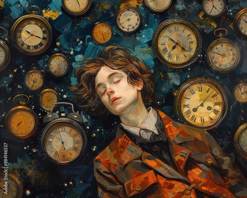 Wall mural : Create a surrealistic painting of a figure surrounded by clocks, each one showing a different time a