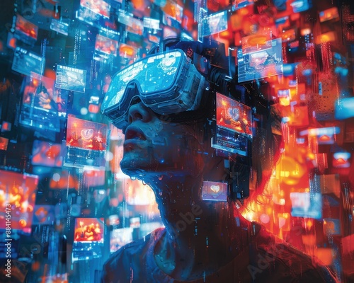 Wall mural create a surrealistic painting of a person surrounded by floating screens displaying different socia