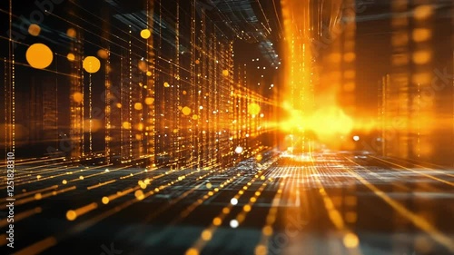 Wall mural : Creating an abstract digital cyberspace tunnel filled with flowing and glowing golden particles, evo
