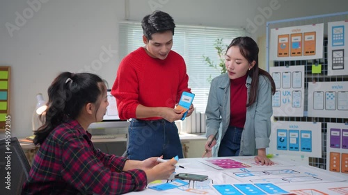The watermark will not be included on Wall mural.: Creative asian web design team collaborating on mobile application development, analyzing project de
