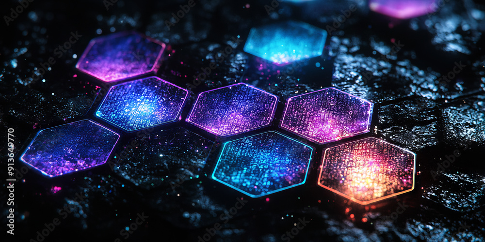 The watermark will not be included on Wall mural.: Creative blue hexagonal background with binary code - technology, design and landing page concept
