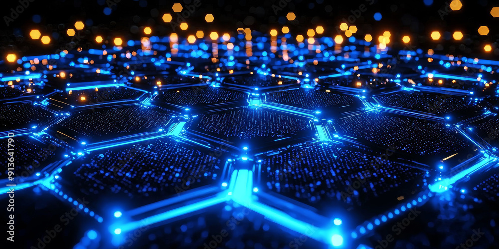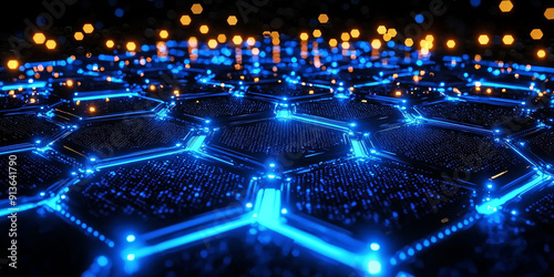 Wall mural : Creative blue hexagonal background with binary code - technology, design and landing page concept