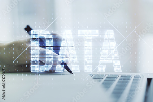Creative data word hologram and hand writing in notebook on background with laptop, big data and bloWall mural