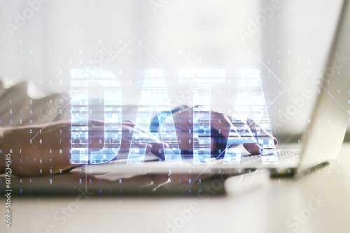Wall mural creative data word hologram and hands typing on computer keyboard on background, big data and blockc
