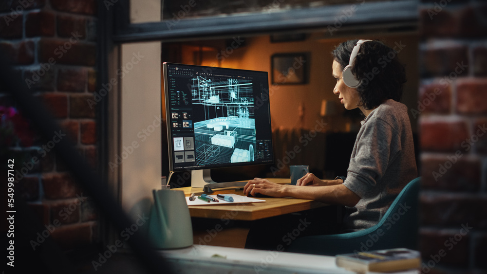 The watermark will not be included on Wall mural.: Creative female 3d architect artist using desktop computer with display showing cad real estate proj