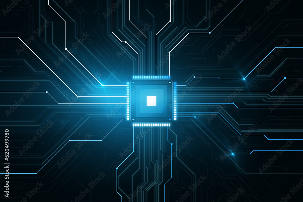 Creative glowing chip circuit hologram on dark background - cpu and metaverse concept - 3d rendering - Wall mural