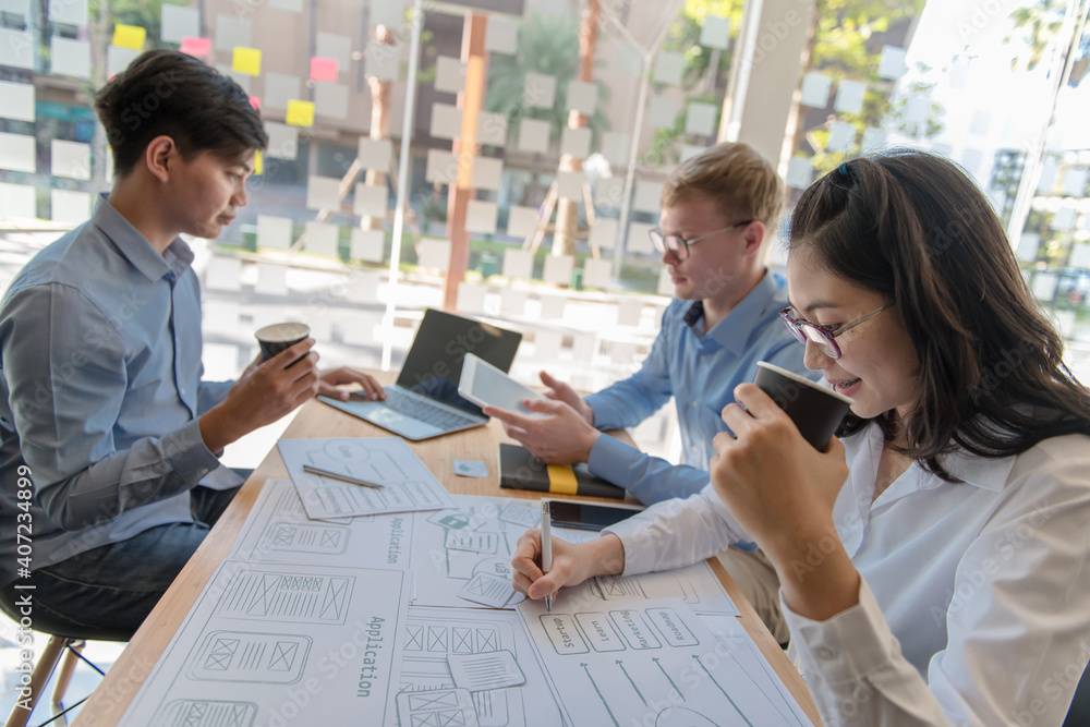 Wall mural : Creative graphic designers team draft planning application development process prototype layout for