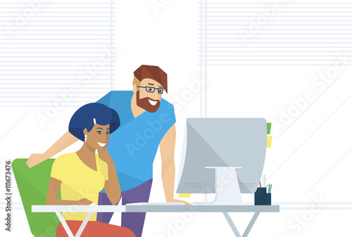 Wall mural creative people working in office with computer. flat illustration of project brainstorming and deve