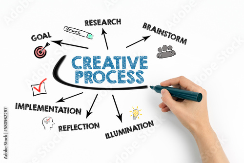 The watermark will not be included on Wall mural.: Creative process concept - chart with keywords and icons on white background