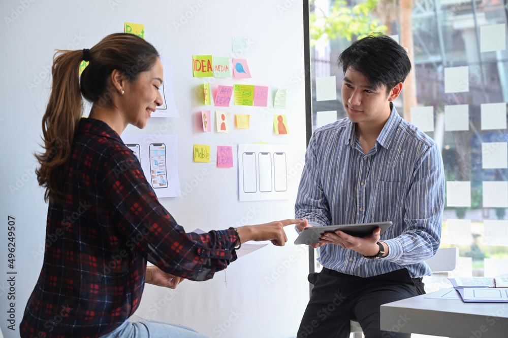 Wall mural creative team brainstorming about mobile app interface wireframe design together.