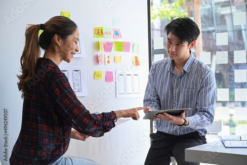 The watermark will not be included on Wall mural.: Creative team brainstorming about mobile app interface wireframe design together -