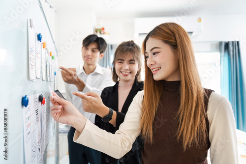 The watermark will not be included on Wall mural.: Creative ux ui team brainstorming for startup business development in modern office environment