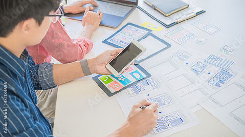 The watermark will not be included on Wall mural.: Creative web designer planning application and developing template layout, framework for mobile phon
