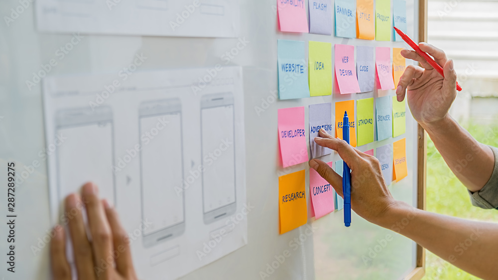 The watermark will not be included on Wall mural.: Creative web designer planning application and developing template layout, framework for mobile phon