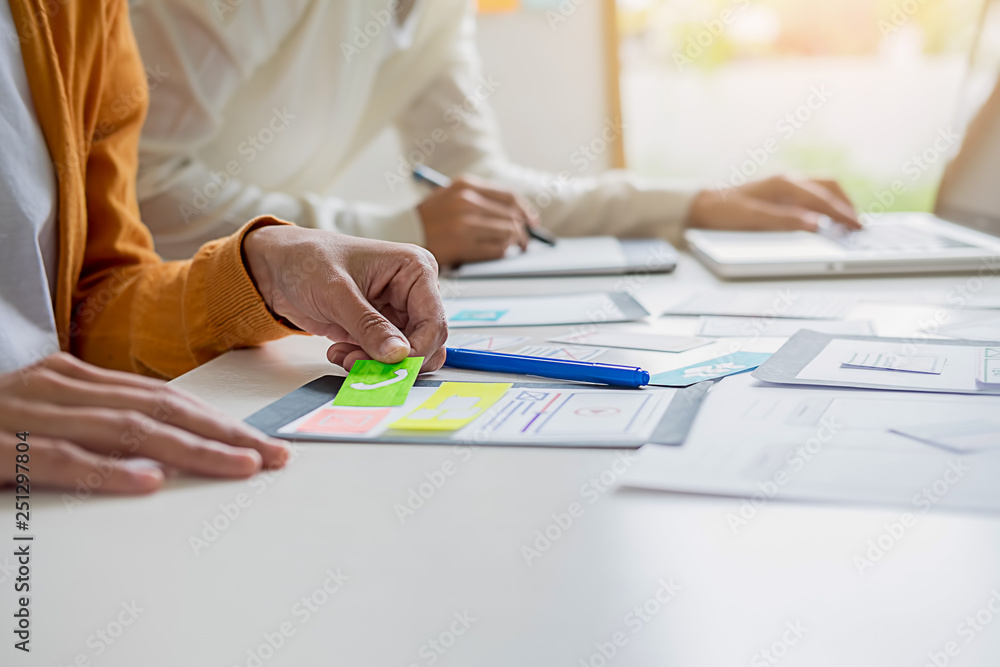 The watermark will not be included on Wall mural.: Creative web designer planning application and developing template layout, framework for mobile phon