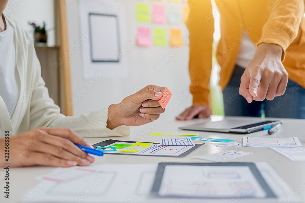 Wall mural : Creative web designer planning application and developing template layout, framework for mobile phon