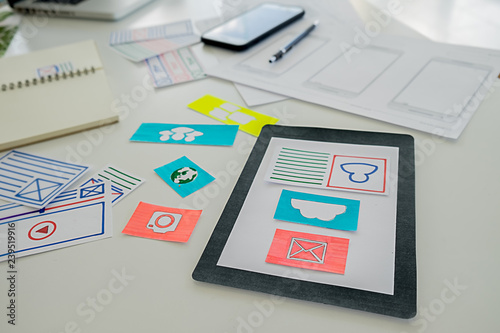 The watermark will not be included on Wall mural.: Creative web designer planning application and developing template layout, framework for mobile phon