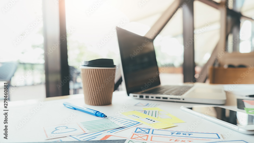 The watermark will not be included on Wall mural.: Creative web designer planning application and developing template layout, framework for mobile phon