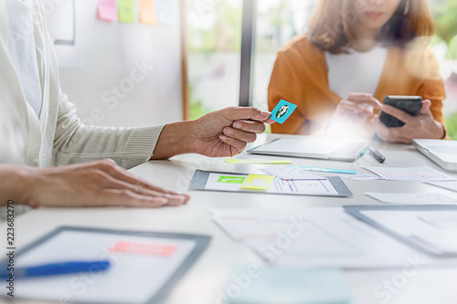 Wall mural : Creative web designer planning application and developing template layout, framework for mobile phon