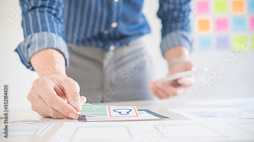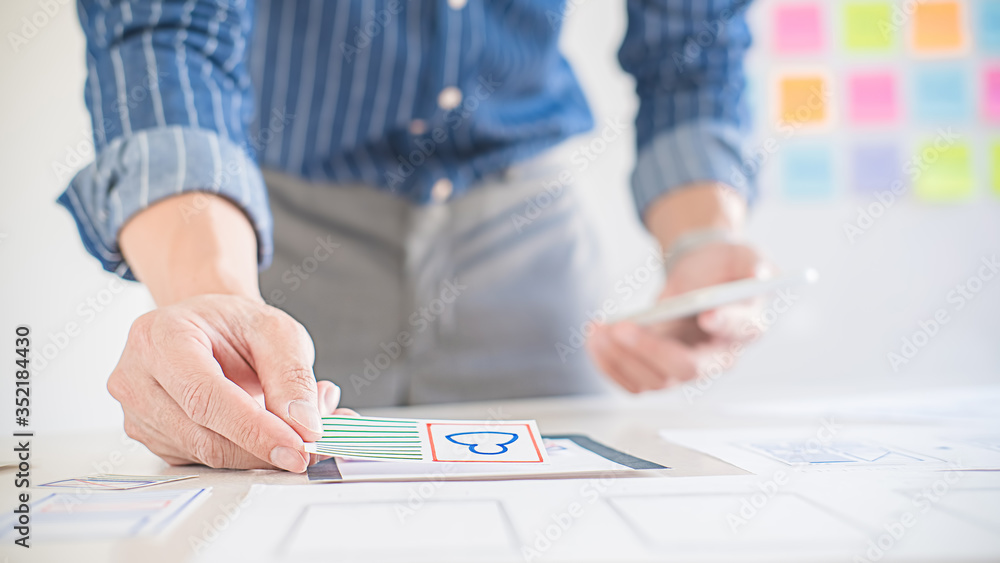 The watermark will not be included on Wall mural.: Creative web designer planning application and developing template layout, framework for mobile phon