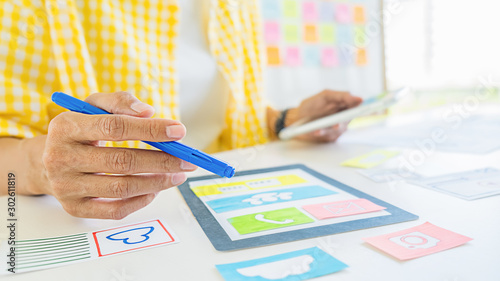 The watermark will not be included on Wall mural.: Creative web designer planning application and developing template layout, framework for mobile phon