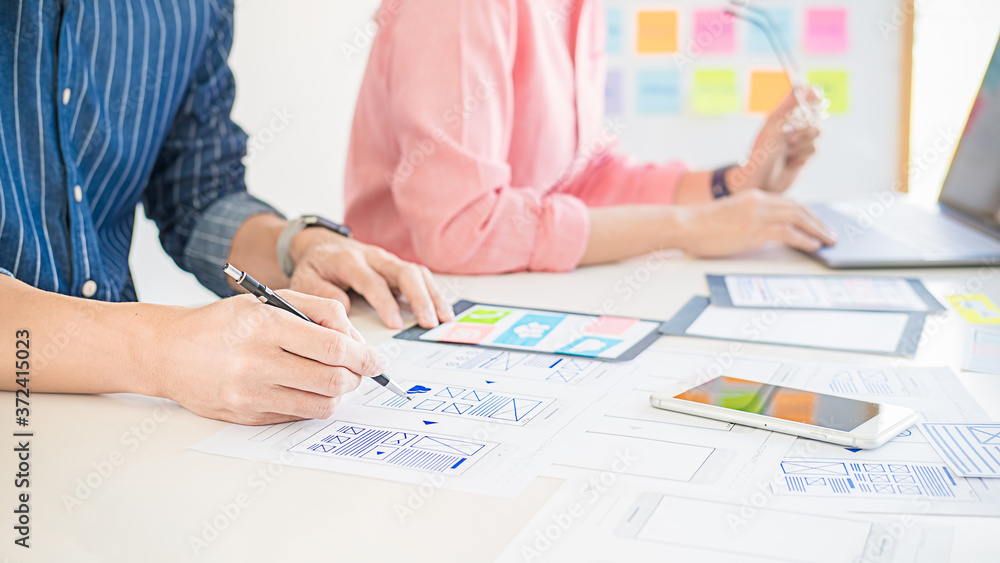 Wall mural : Creative web designer planning application and developing template layout, framework for mobile phon