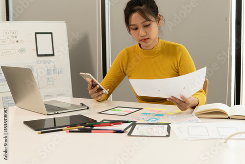 Wall mural : Creative web designer planning ui application and developing digital template
