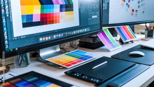 Wall mural : Creative workspace with dual monitors displaying colorful design palettes for graphic design project