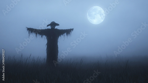 Wall mural creepy scarecrow standing alone in a foggy field under the moon - Wall murals Wall mural creepy scarecrow standing alone in a foggy field under the moon - Wall murals