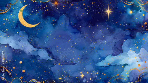 Wall mural cresent moon in starry night sky in watercolor illustration and geometric patterns for wallpaper and - Wall murals Wall mural cresent moon in starry night sky in watercolor illustration and geometric patterns for wallpaper and - Wall murals