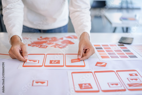 Wall mural : Cropped shot of creative ux ui designers team designing, developing mobile application from prototyp