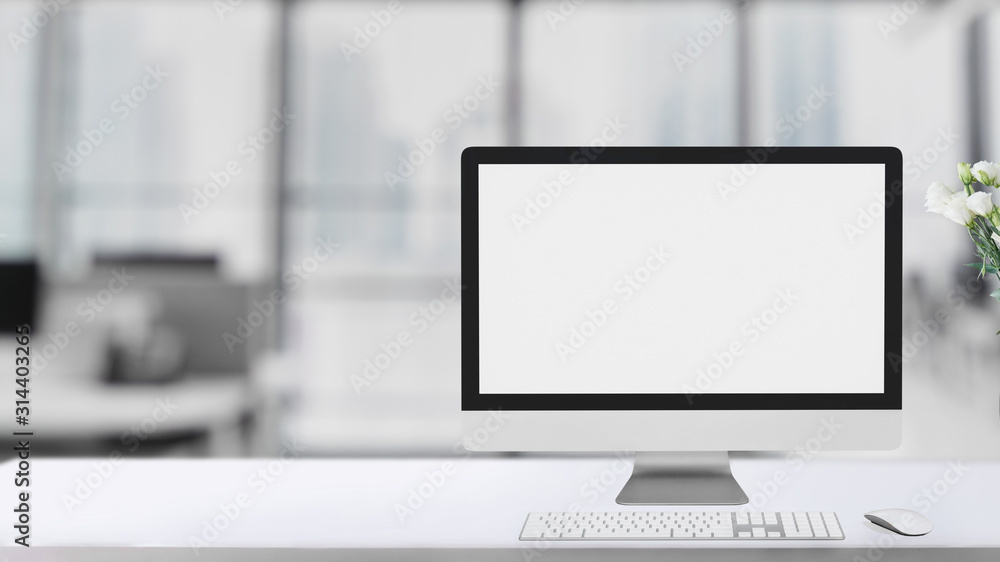 The watermark will not be included on Wall mural.: Cropped shot of simple workspace with blank screen computer on white table with blurred office room