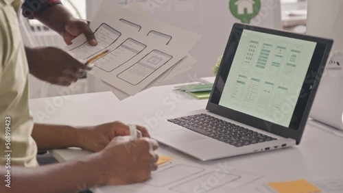 Wall mural : Cropped shot of two male ux designer discussing scheme of mobile app interface on paper and laptop a
