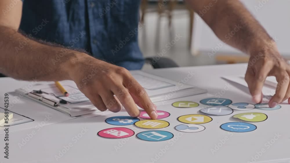 Cropped shot of ux designer examining icons and taking notes of layout sketches while working on mobWall mural