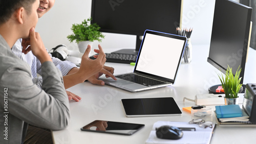 The watermark will not be included on Wall mural.: Cropped shot programmers meeting with developer workspace and empty screen mockup laptop -