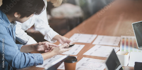 Cropped view of ui designer planing the ux application development with team membersWall mural