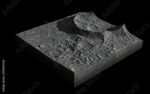 The watermark will not be included on Wall mural.: Cross section of a crater on the surface of the moon, terrain model isolated on black background