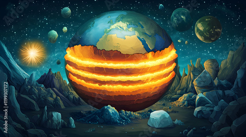 Cross-section of the earth's core with glowing layers illustrating the mantle, crust and core, surroWall mural