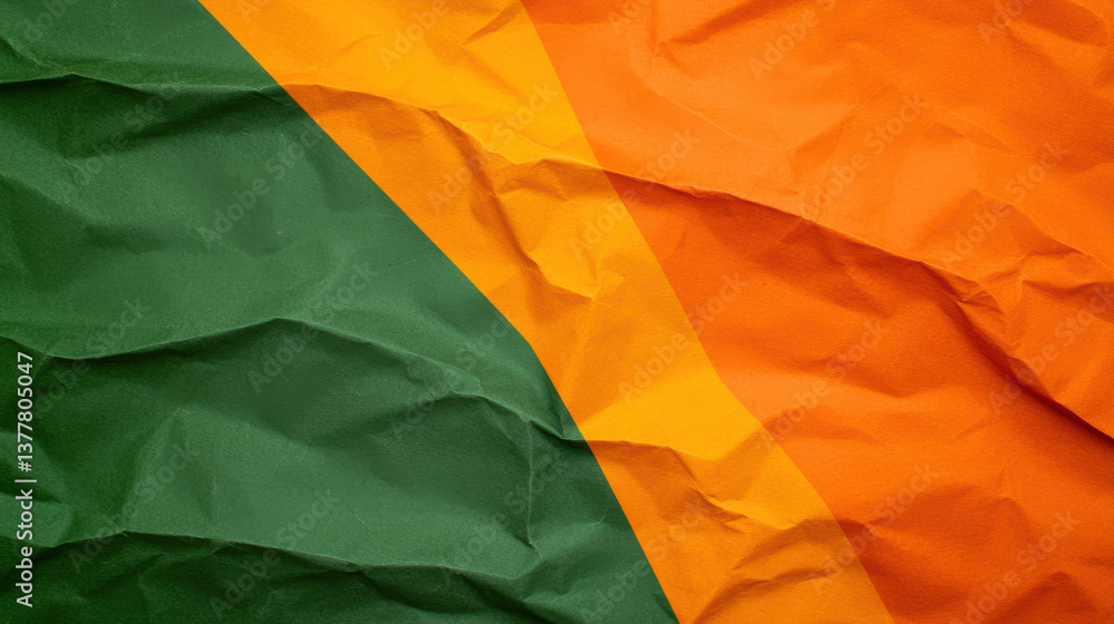 The watermark will not be included on Wall mural.: Crumpled paper texture featuring green and orange colors, creating vibrant and dynamic visual effect