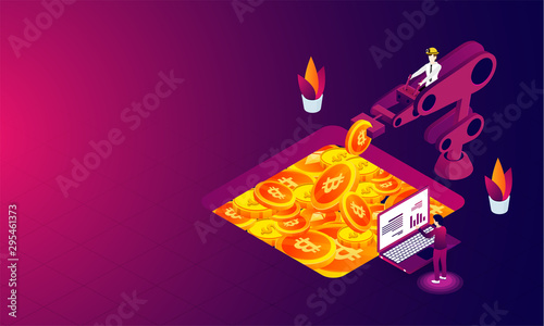 Wall mural : Crypto mining concept based isometric design, man working with robotic arm on glossy background -